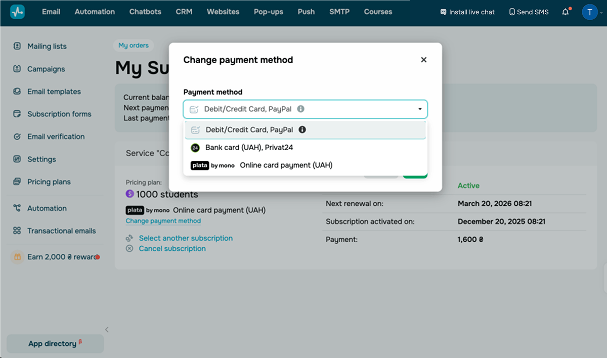 Как изменить способ оплаты подписки