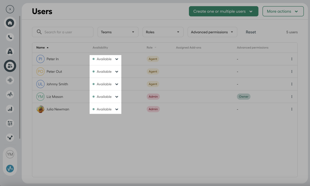 Чтобы пользователь мог принимать или совершать звонки, убедитесь, что после активации в Teams & Users он имеет статус Available. Если статус отличается, отправьте пользователю повторное приглашение или проверьте его права в аккаунте AirCall.