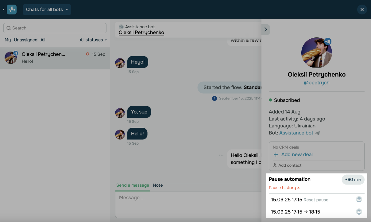 | Приостановление авторассылок | Приостанавливает отправку сообщений бота через автоответы в цепочках и массовых рассылках. Так вы можете продлить паузу, если отвечали подписчику вручную и хотите приостановить цепочки еще на час. Для этого в секции Остановить авторассылки (Pause automation) нажмите кнопку +60 min.