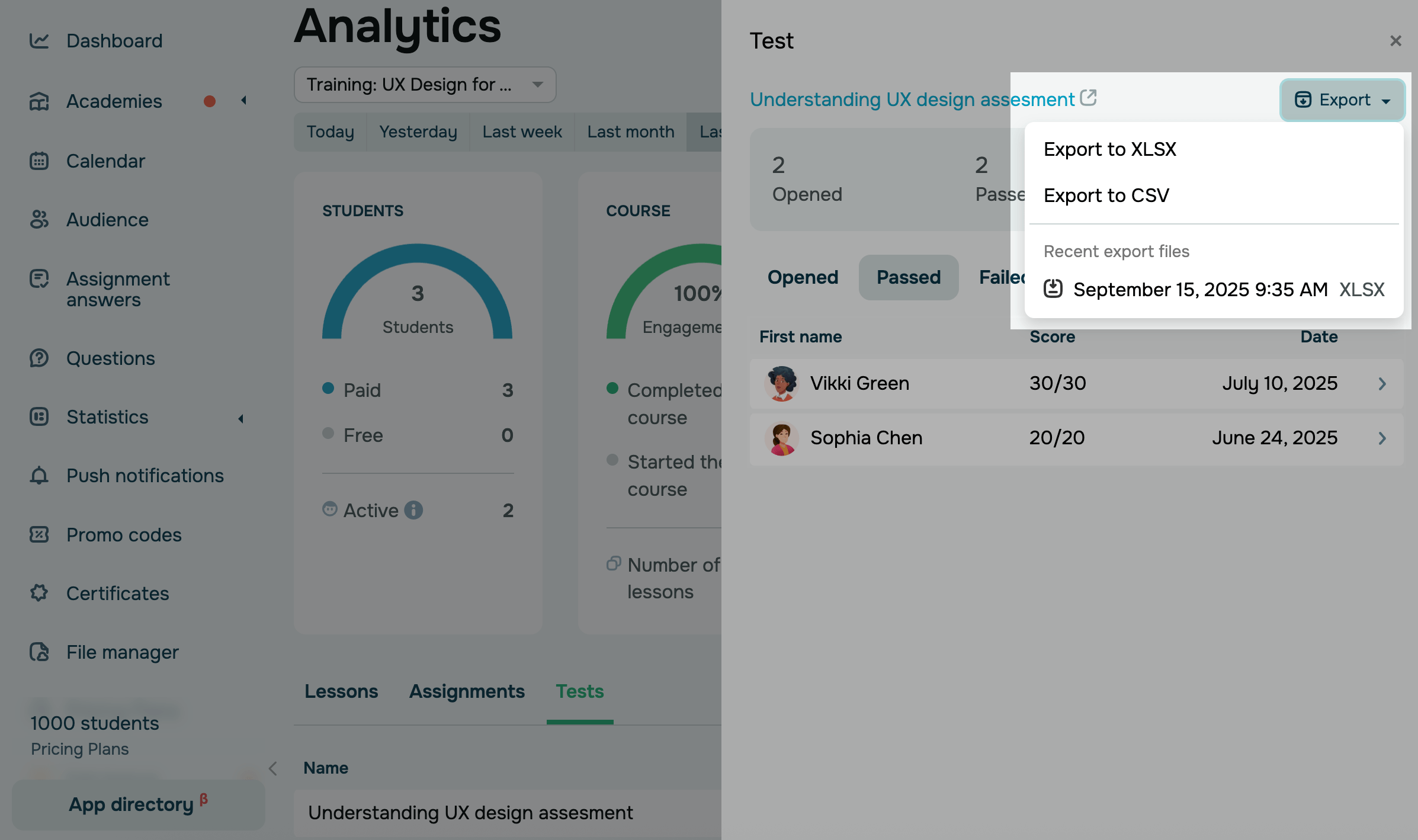 Переключайтесь между вкладками Зашли (Opened), Успешно прошли (Passed) и Неуспешно прошли (Failed), чтобы узнать имена студентов, набранный балл за тест и дату их активности.