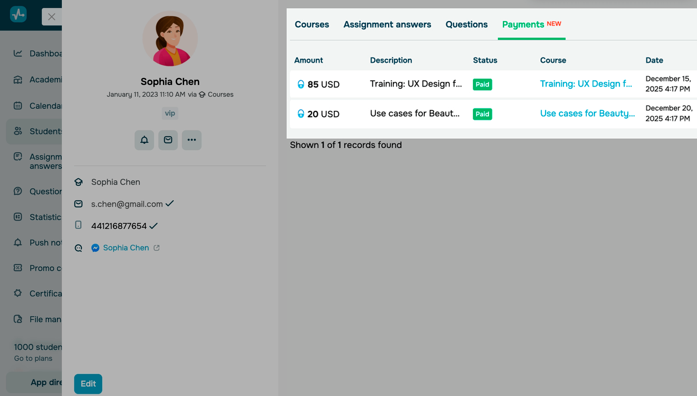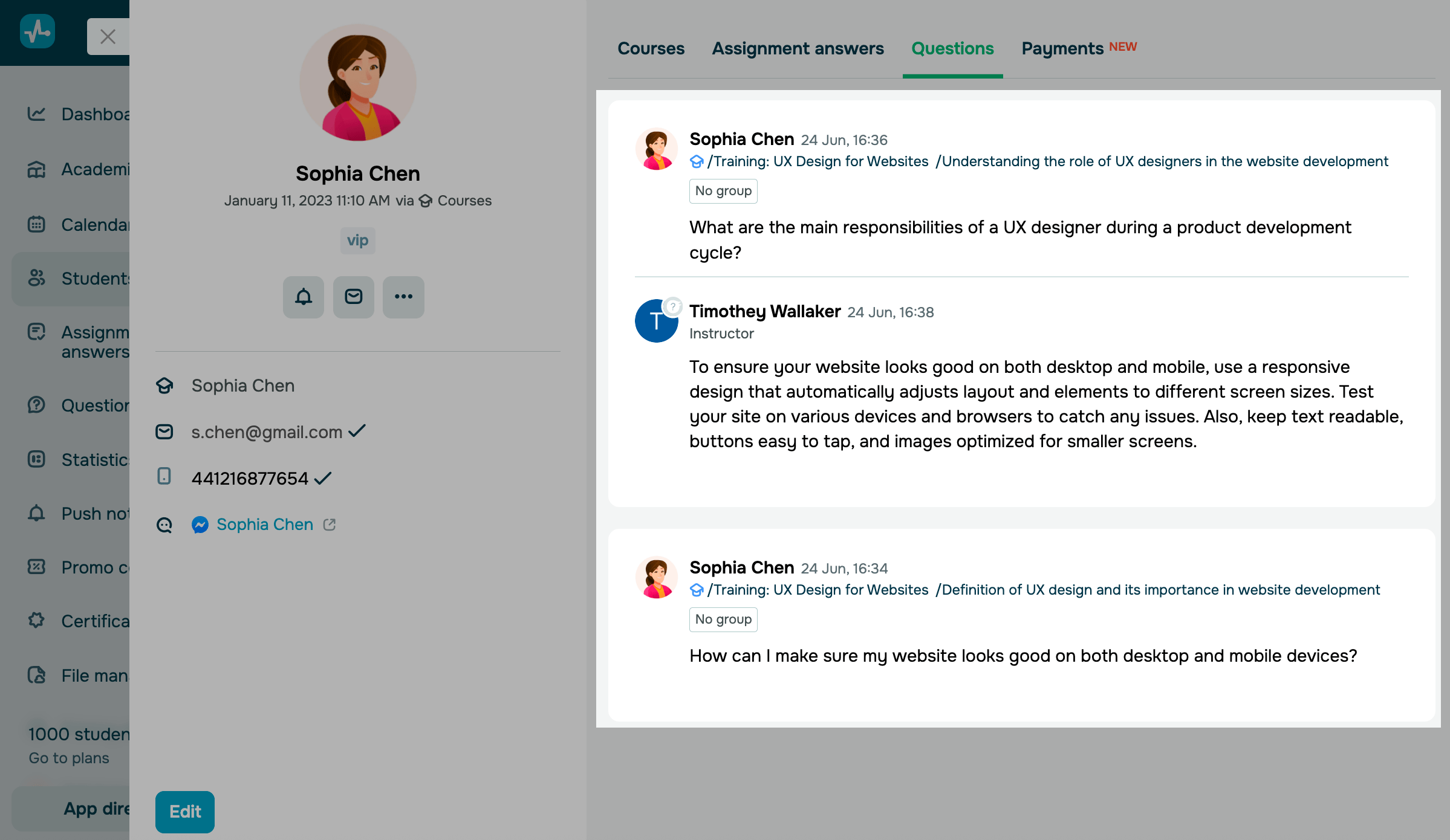Карточка студента — это персональный профиль, где собраны все ключевые данные: контактная информация, активные курсы, прогресс, задания и история вопросов. Это позволяет быстро просматривать информацию и работать со студентом индивидуально.