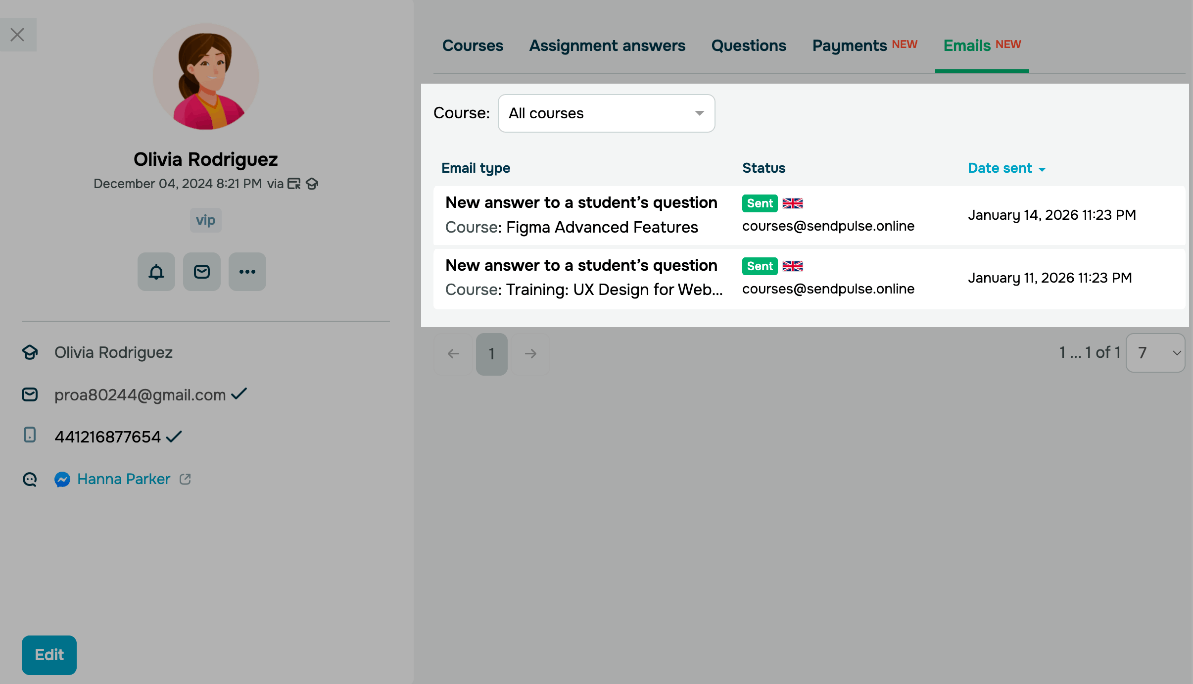 Во вкладке Письма (Emails) собраны все системные письма, которые были отправлены студенту за период его обучения.