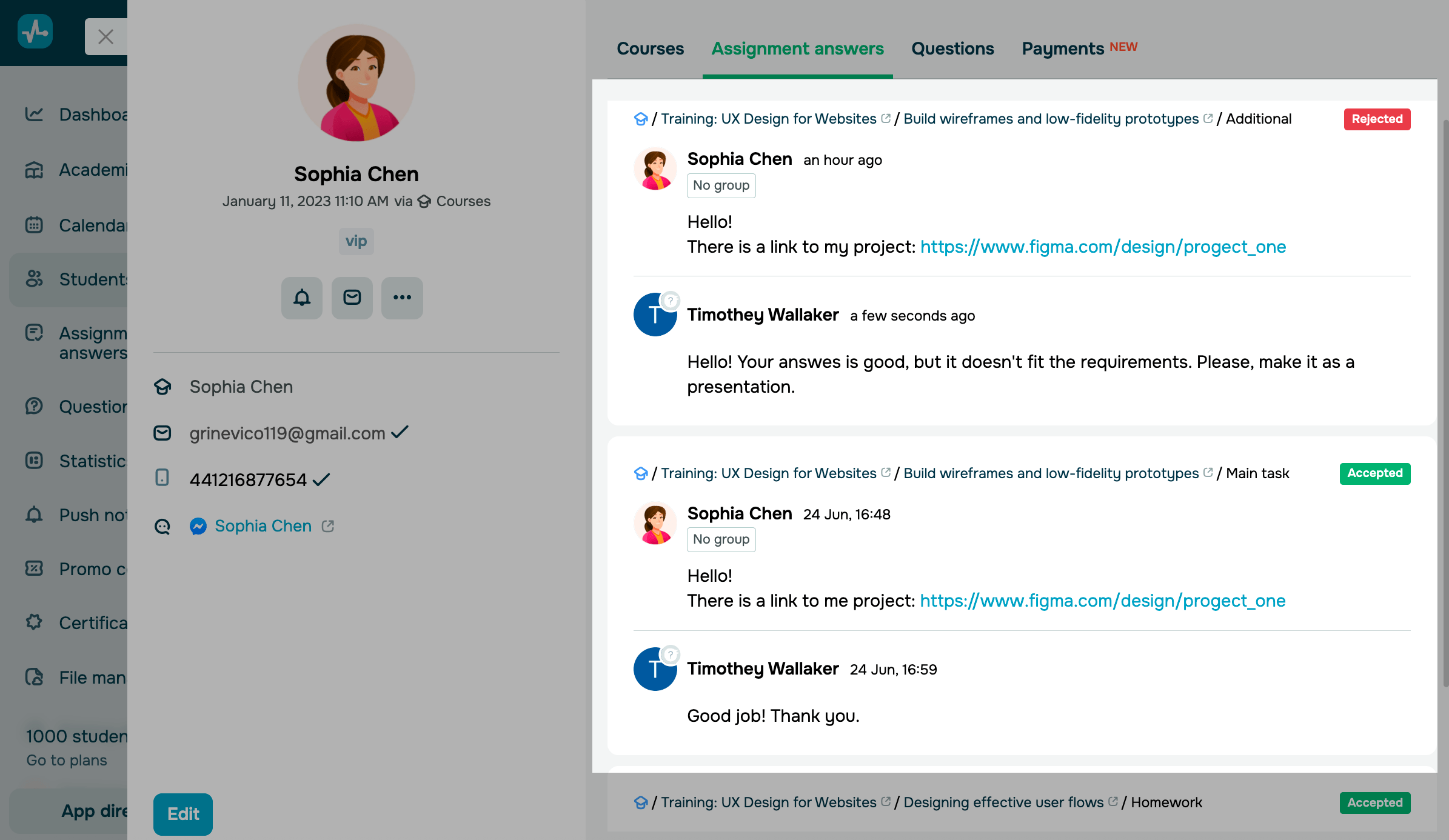 Принято,Ожидает проверкиилиОтклонено); - ответы и комментарии, оставленные преподавателем.