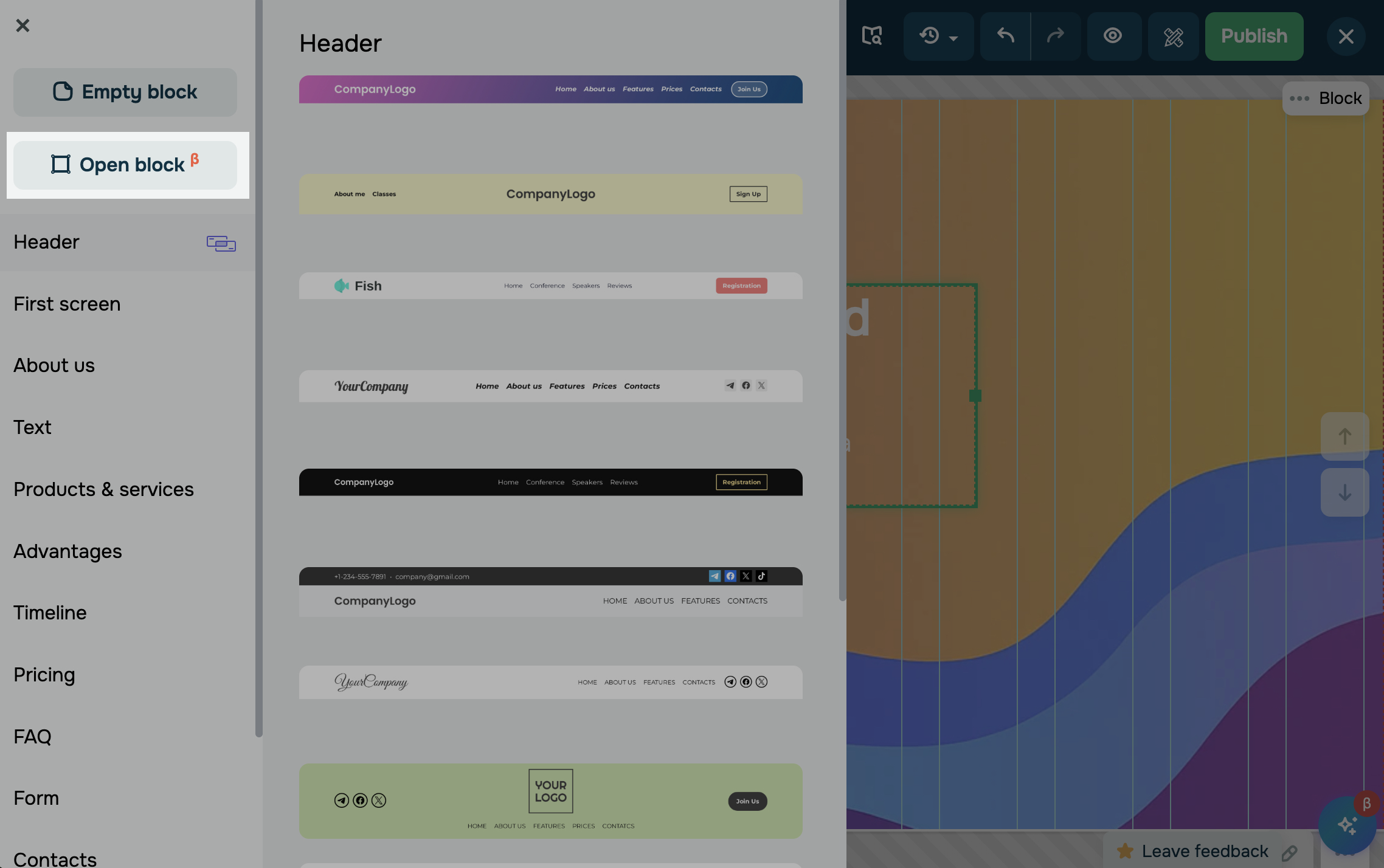 Перейдите в конструктор сайта и нажмите + Добавить блок. Выберите в панели элементов Открытый блок.