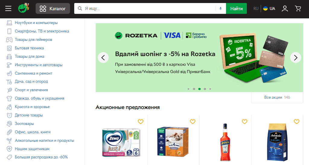 Rozetka — интернет-магазин, который заработал в 2005 году. Бизнес начинал свою деятельность исключительно онлайн. Ассортимент магазина регулярно расширялся и пополнялся новыми категориями. В интернет-магазине можно купить смартфоны, бытовую технику, сантехнику, товары для дачи, одежду, зоотовары и много другого.